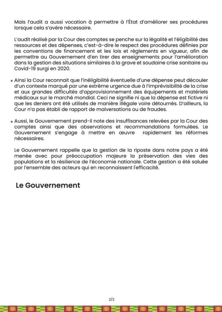 Le gouvernement de Madame Victoire TOMEGAH-DOGBE souligne le fait que la Cour ait noté «la conformité régulière et sincère des dépenses relatives à ce fonds» avant de «prendre note des insuffisances relevées par la Cour des comptes ainsi que des observations et recommandations formulées» et de «s’engager à mettre en œuvre rapidement les réformes nécessaires.»