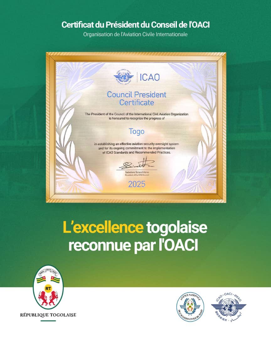 Pour la première fois de son histoire, le Togo a reçu un certificat de reconnaissance du Conseil de l’Organisation de l’Aviation Civile Internationale ( OACI).