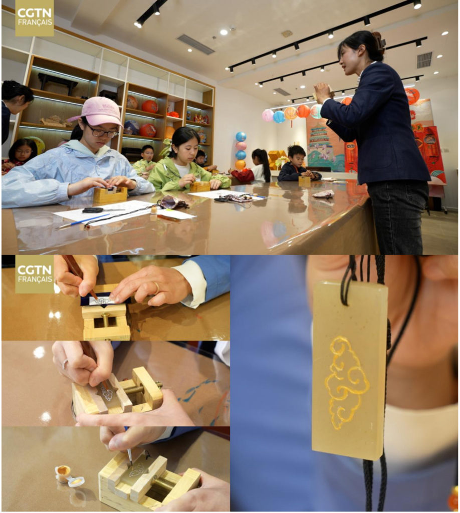 Dans cet atelier, nous pouvons apprendre à sculpter le jade en suivant trois étapes : l’impression des motifs, la sculpture du jade, puis le remplissage des motifs avec de la poudre d’or. Ces activités éducatives permettent aux jeunes de s’initier à un art traditionnel tout en éveillant leur créativité.